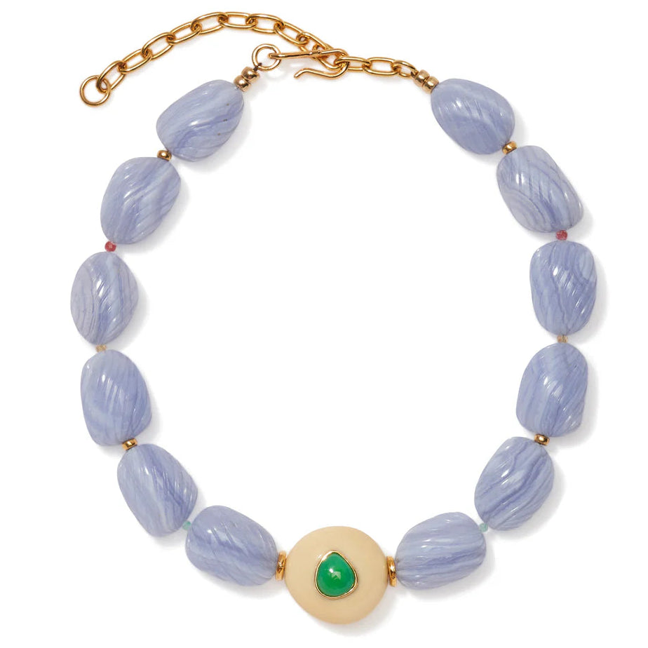 Create a captivating and sophisticated statement in this striking collar necklace of carved blue chalcedony beads. Dotted with semiprecious accents and finished with an ivory-colored resin focal inlaid with a vivid chrysoprase stone.