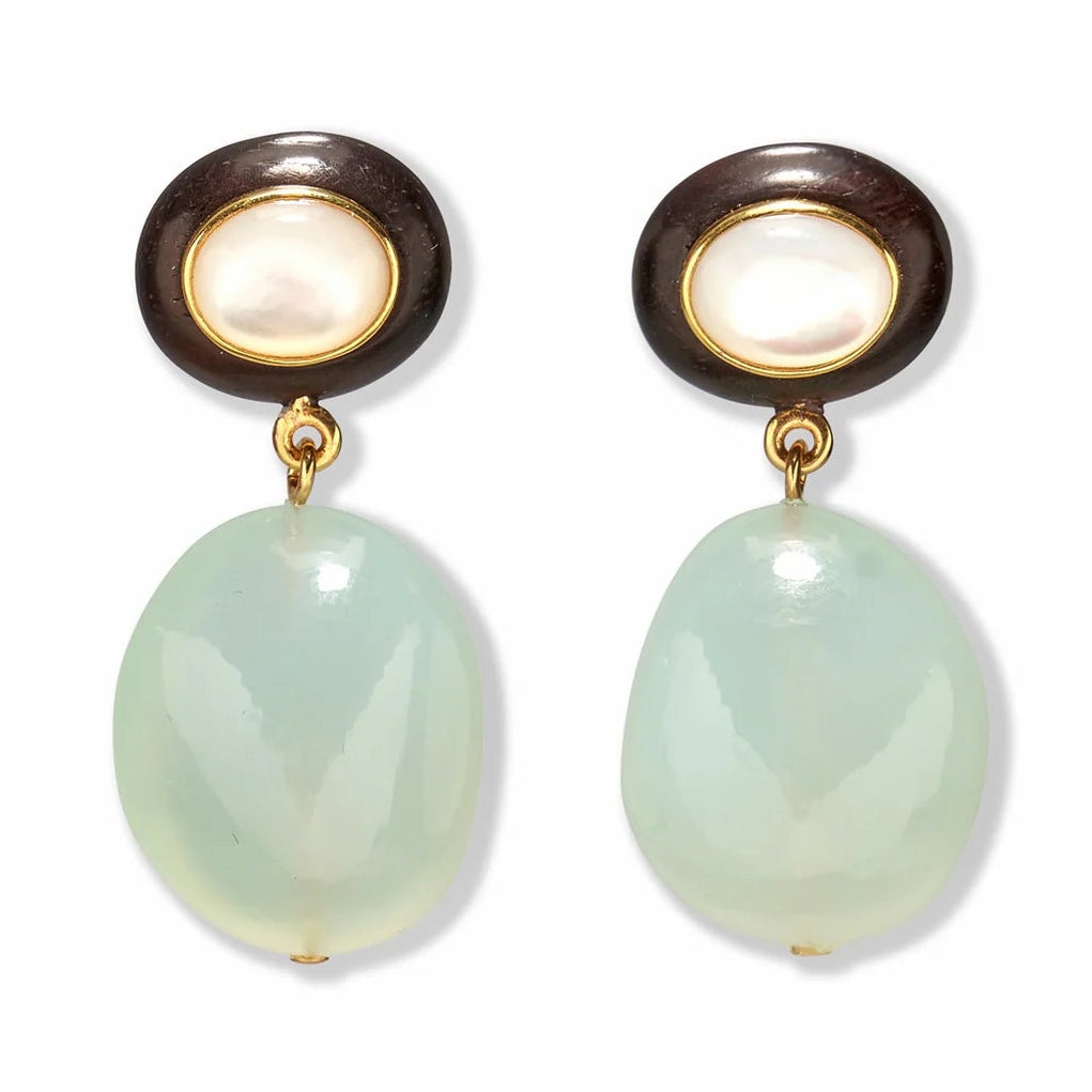 Rest on our laurels? Not likely. These earrings bring an ultra fresh take to a familiar drop silhouette. In gold-plated brass with wood and inlaid mother-of-pearl tops, and aqua-colored chalcedony bead drops.