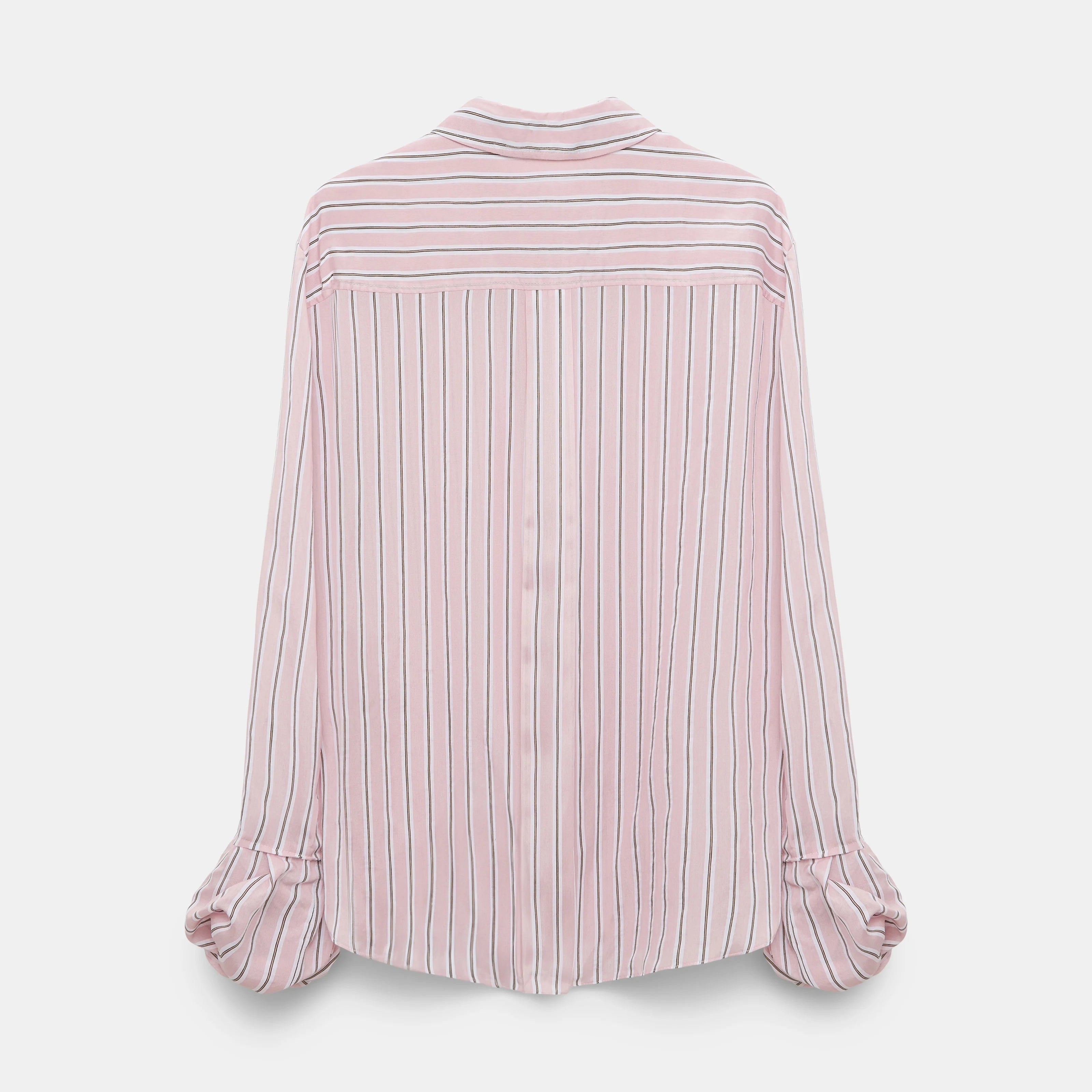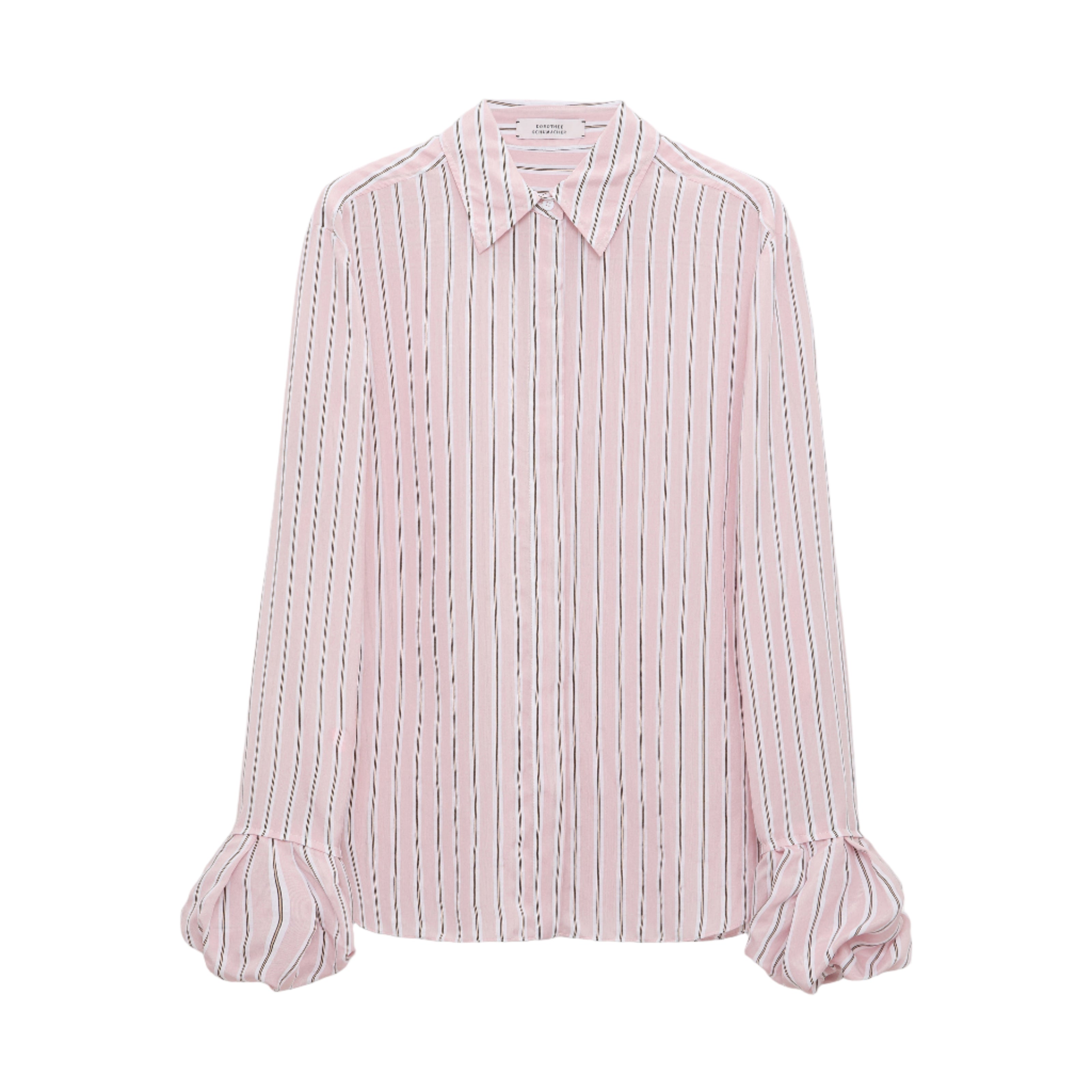 The striped blouse is made from organdy voile and features gathered balloon cuffs. The shirt has a classic collar and concealed button front.
