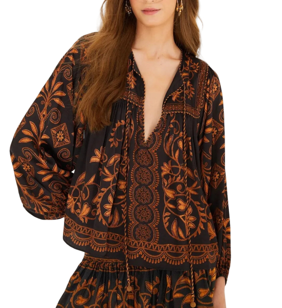 Escape to paradise with the Cornely Ainika Blouse, where black and gold florals dance across luxurious fabric like a tropical sunset. Those gorgeous beaded tassel ties? They're basically your ticket to instant vacation vibes, swaying with every move you make. Whether you're heading to brunch or a beachside soirée, this blouse brings the fun and the flair—because life's too short for boring basics.