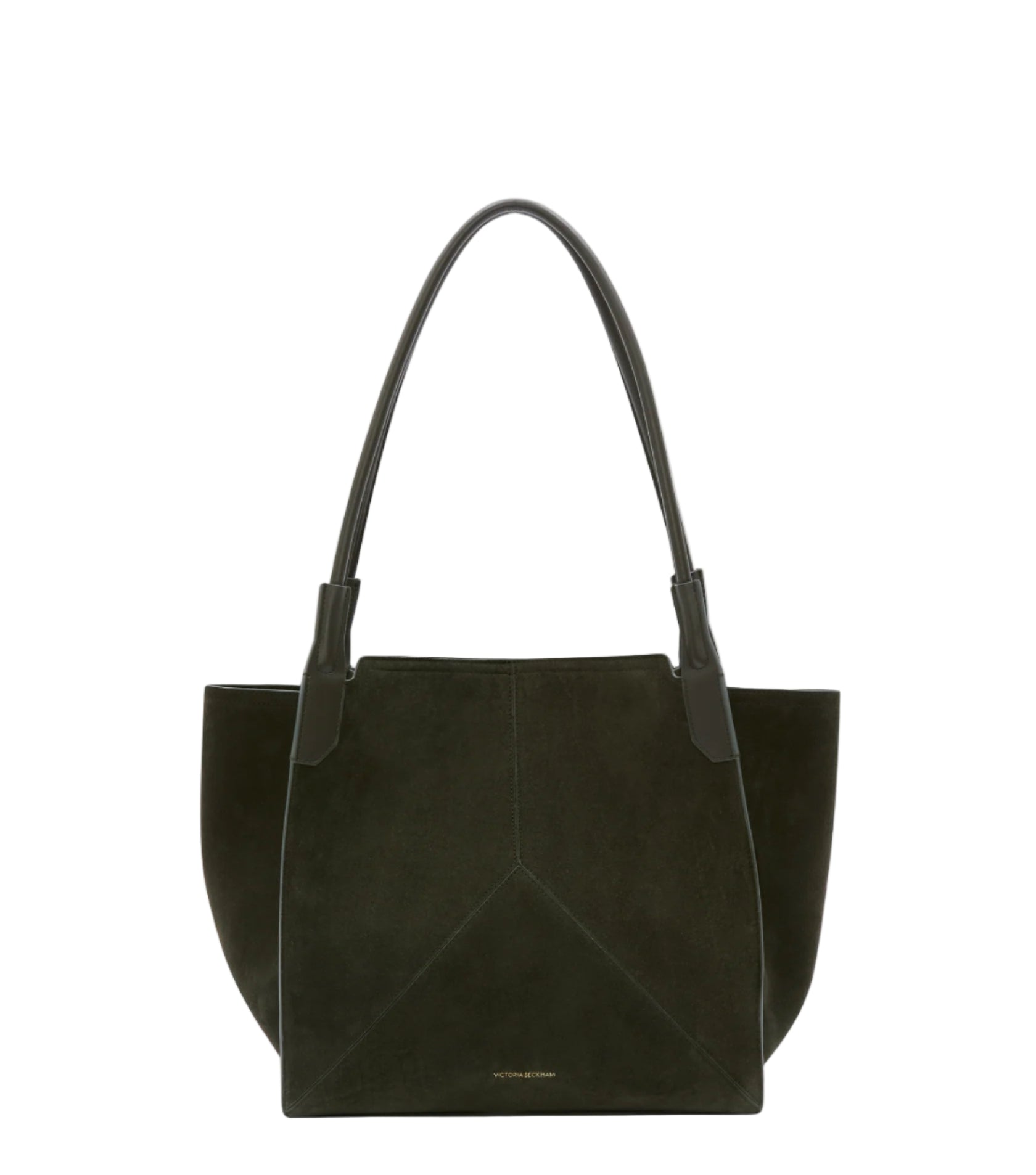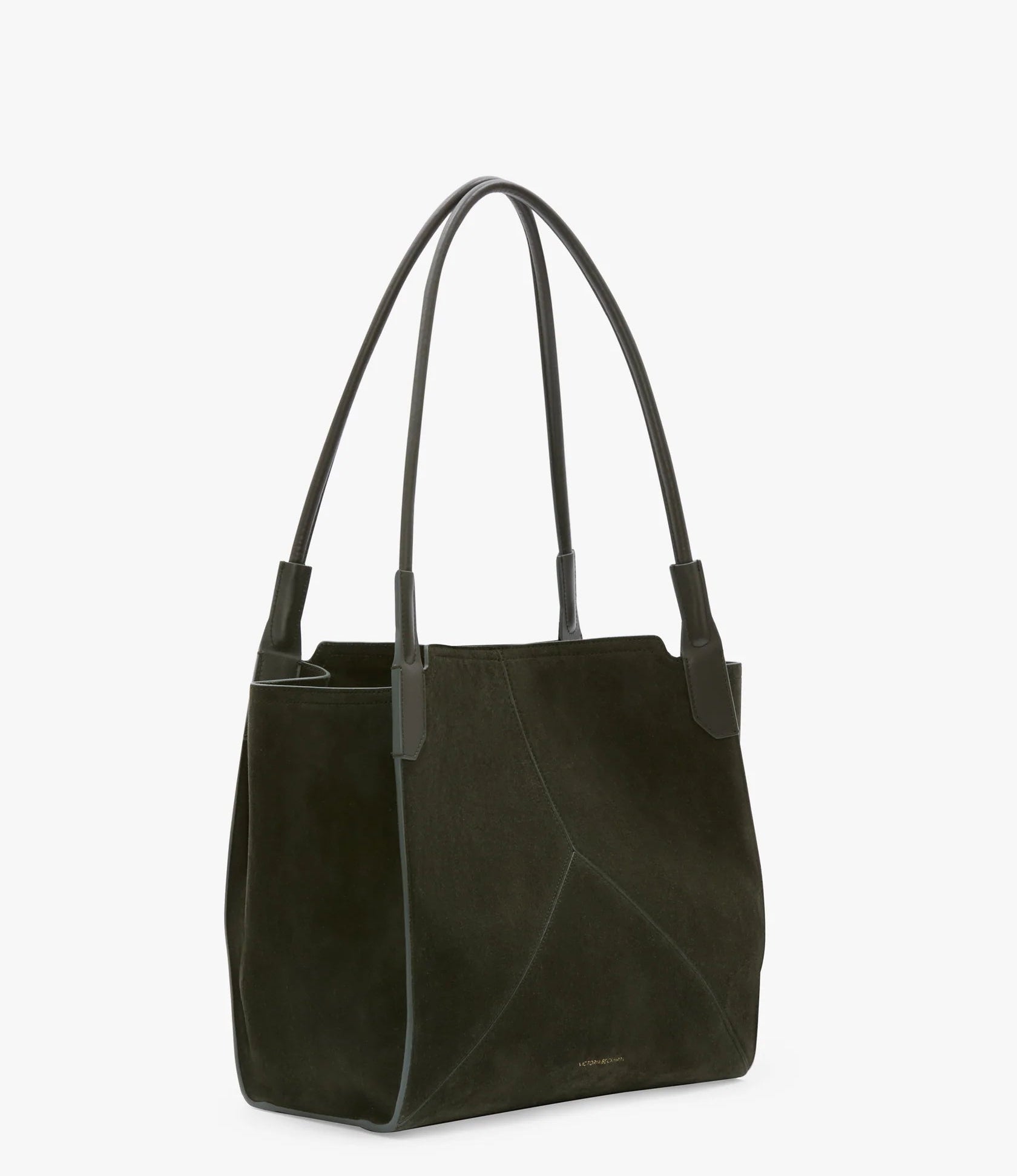 A diminutive version of the Victoria Tote, the Victoria Tote in Dark Olive suede has the same unstructured silhouette, simple lines and discreetly decorative V-stitched panels. Crafted in Italy, it is finished with tonal suede lining and an internal flat pocket. Understated but sophisticated, it is an ideal accessory for everyday wear.