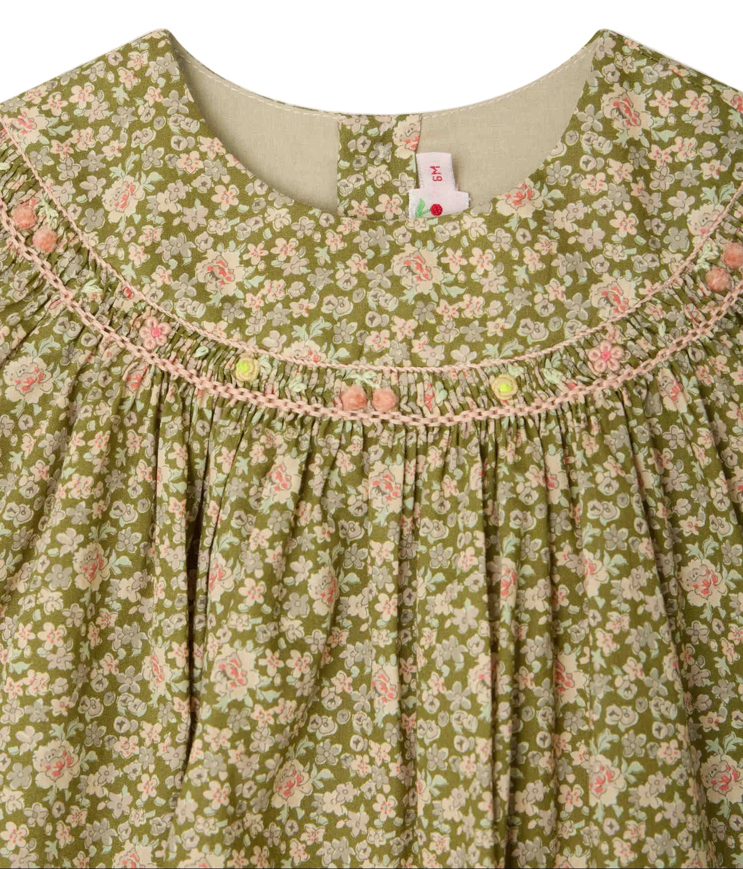 This Amantine dress for babies captivates with its timeless elegance and delicate floral print Liberty fabric. Hand-embroidered smocking under the rounded yoke adds a refined touch. It is lined in cotton voile, while the buttoned fastening at the back helps with dressing. This midi dress offers a lightweight and comfortable option for warmer days.