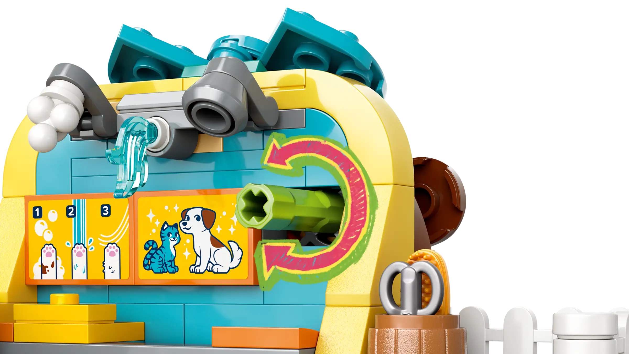 Join Nova, Leo and Matilde as they pick out new hats and accessories for their furry friends Churro, Pickle and Amos. Take the pets on the elevator to the grooming area, where a conveyor belt moves them through the soaping, washing and drying stations. Then check out the accessories on sale, including a chef’s hat, baseball cap and yarn ball. There’s also money and a cash register so kids can create their own customer moments. Watch out for the dog poop!Luckily there’s a shovel for emergency cleanups! Discover more humorous details – like the building’s pup design, complete with moving eyebrows and spinning bow.