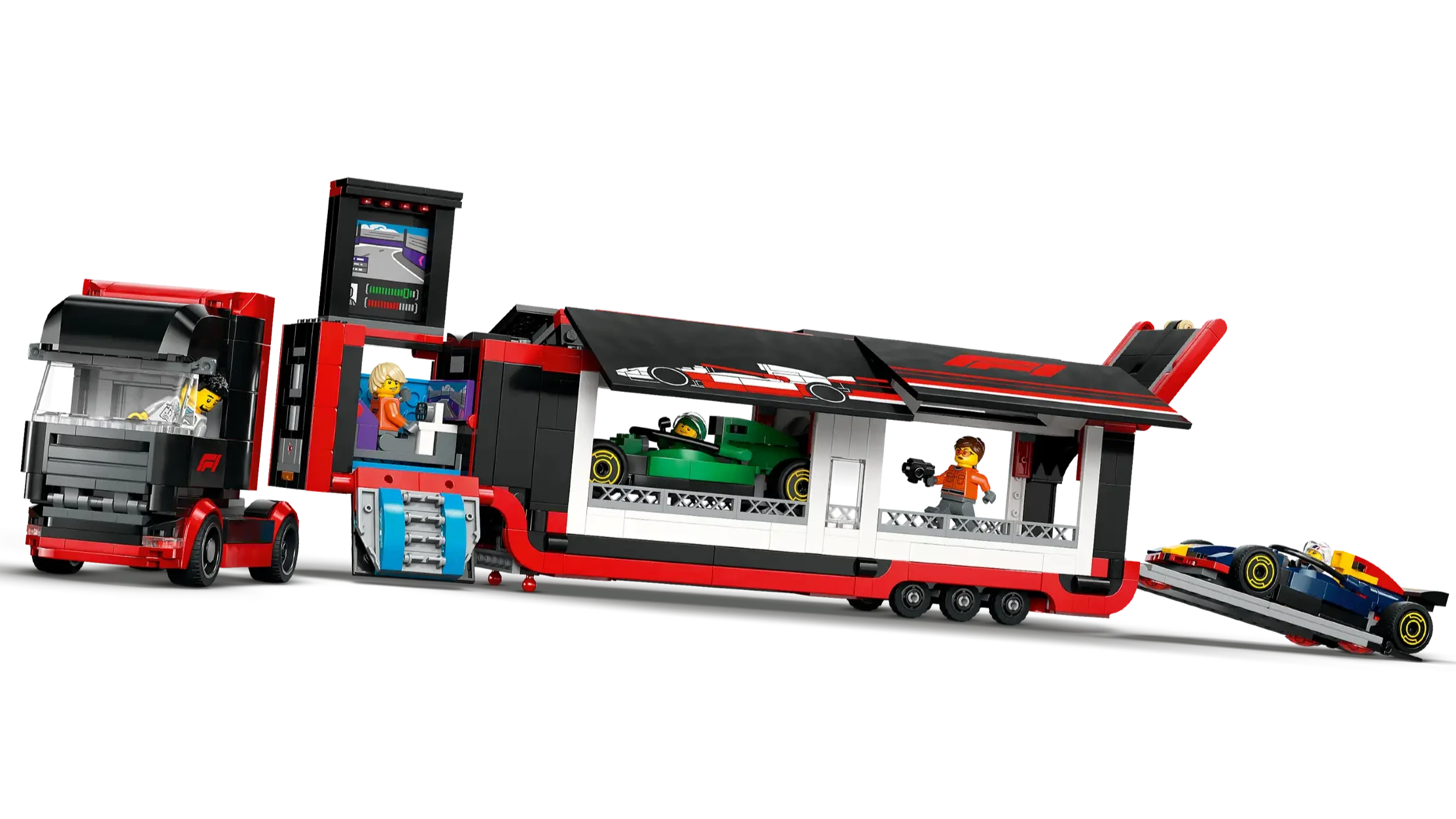 Looking for a Formula 1® car-themed gift for your young racing fan? Introducing the colossal LEGO® City F1® Truck with RB20 & AMR24 F1® Cars playset for ages 8 and up. This premium transport truck toy features a detachable low-swept trailer with an F1 simulator room and a double vehicle bay with fully opening side panels. Kids can lift the rear hatch and slide out the loading ramps to board the cool RB20 and AMR24 F1 race cars. The set also includes 2 driver and 3 race crew minifigures, plus a trophy for epic racetrack roleplay.