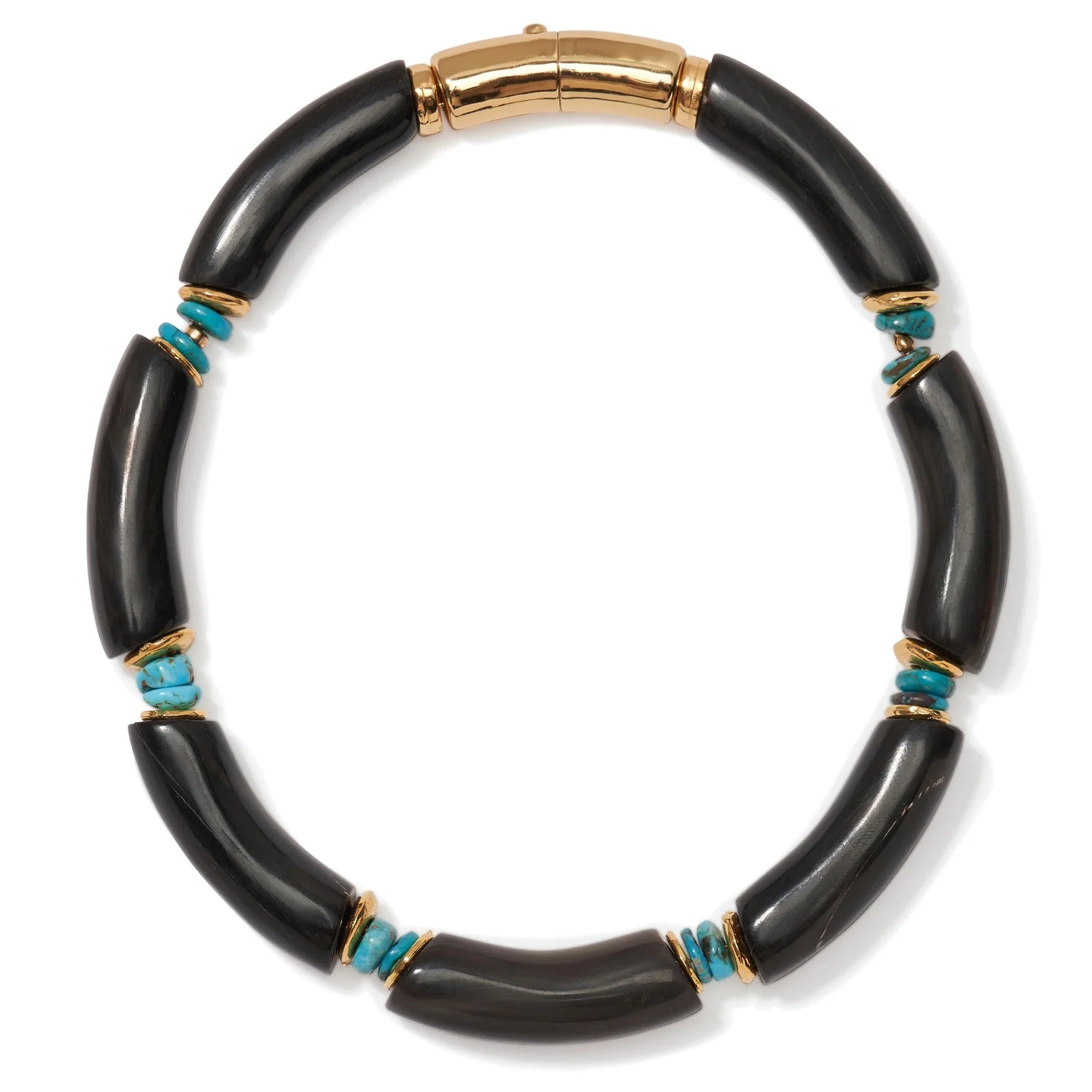 Style? It's practically our religion, and we plan to wear this sleek, worship-worthy necklace everywhere. With black tubular horn beads, dotted turquoise accents, and gold-plated brass macaroni closure.