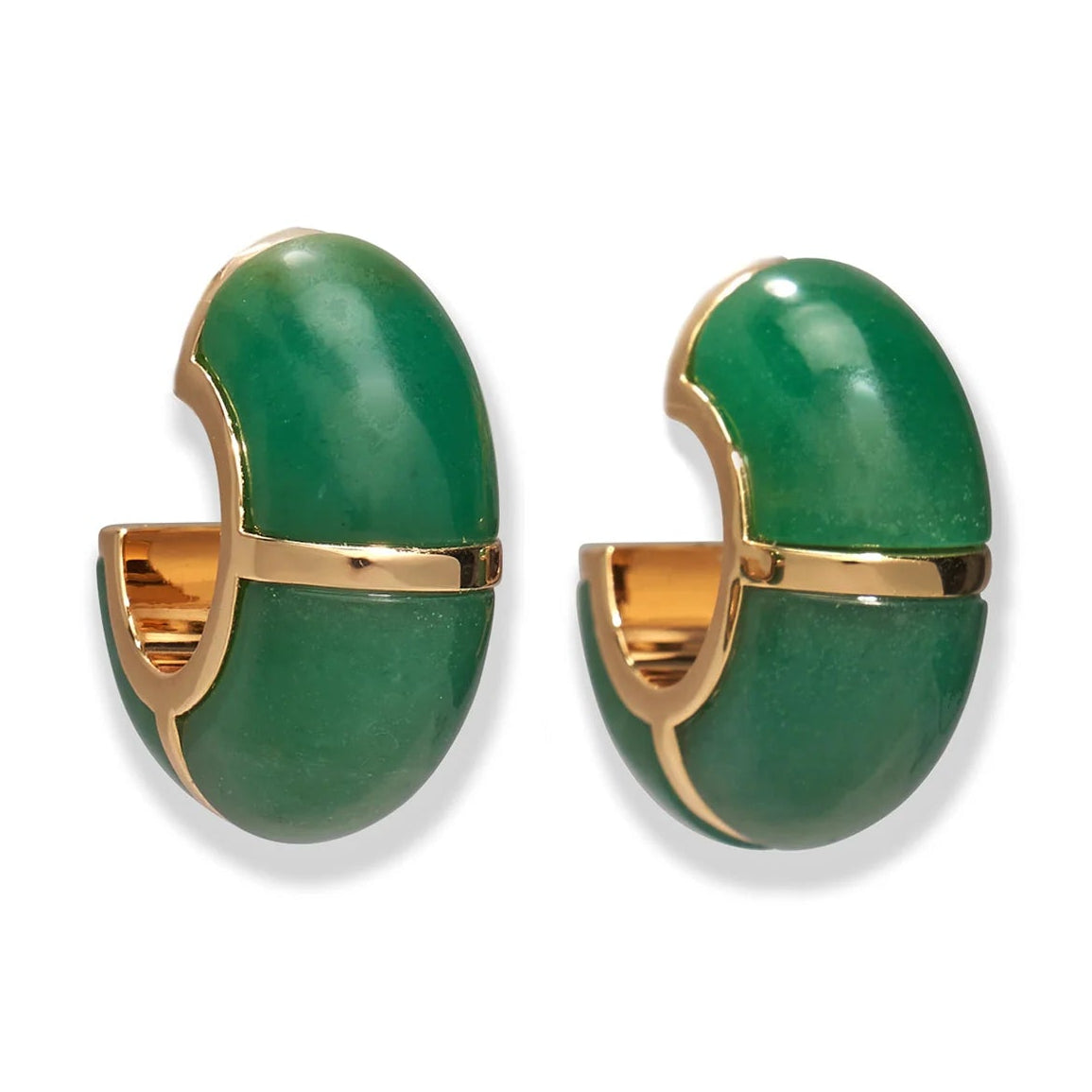 The design team took inspiration from the traditional glazed Zellige tiles handcrafted in Morocco and created these hoops, our freshest new silhouette in gold-plated brass with African jade stone inlay.