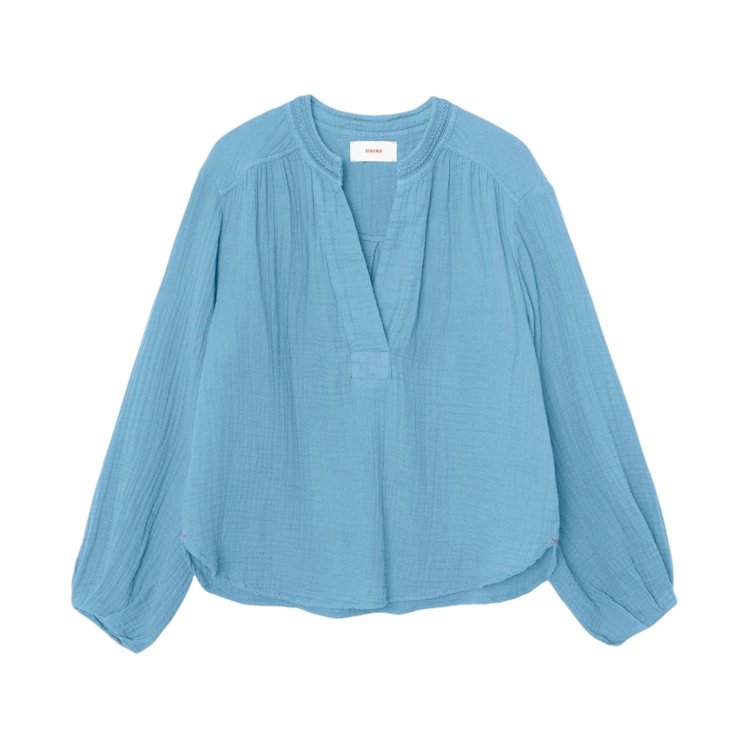 Arielle is new this season in Xirena's washed double faced cotton gauze for a soft, gently crinkled feel. This V-neck popover top is detailed with braided trim at the neckline, blouson sleeves with elasticized cuffs, and a shirttail hem.