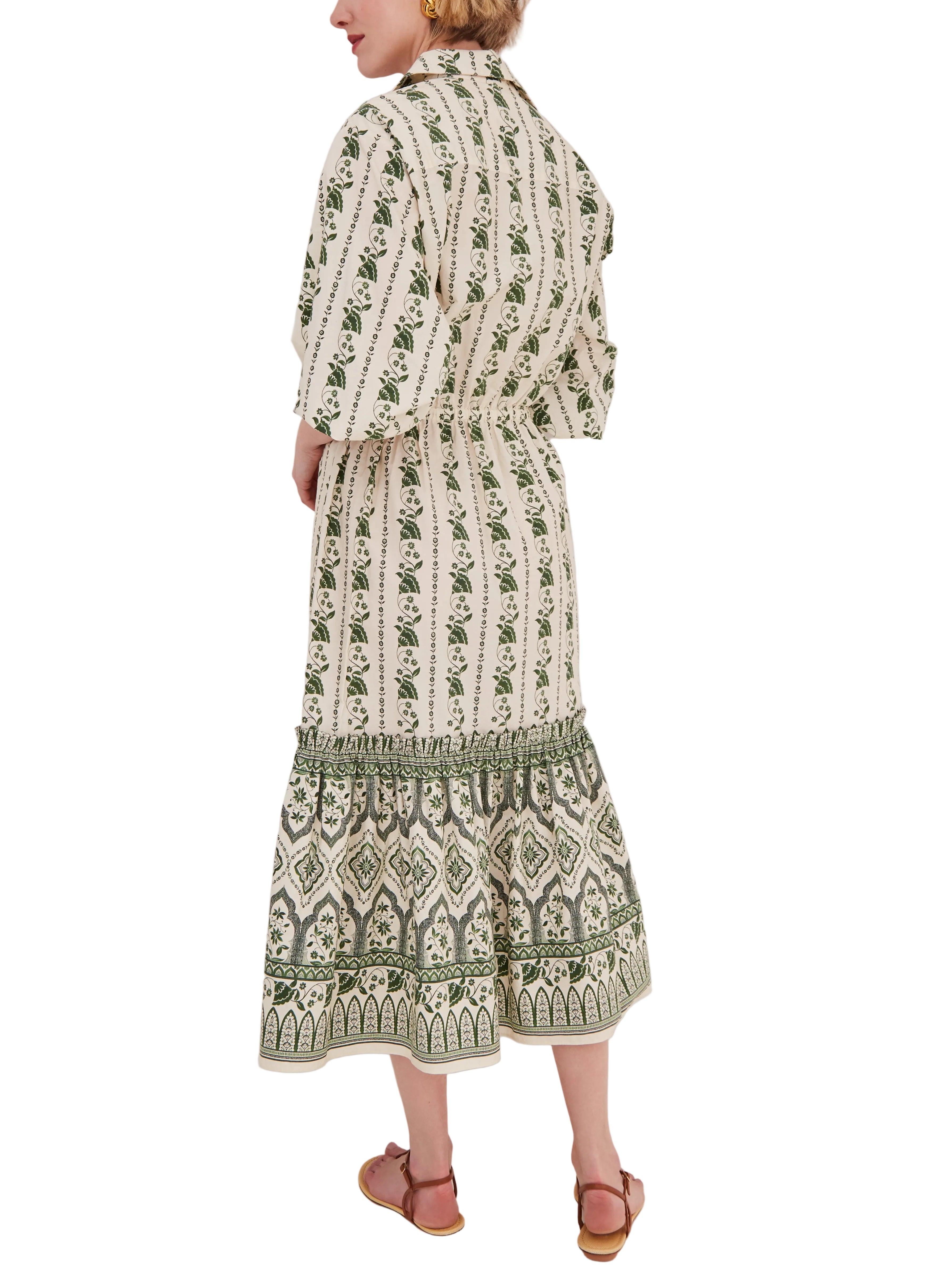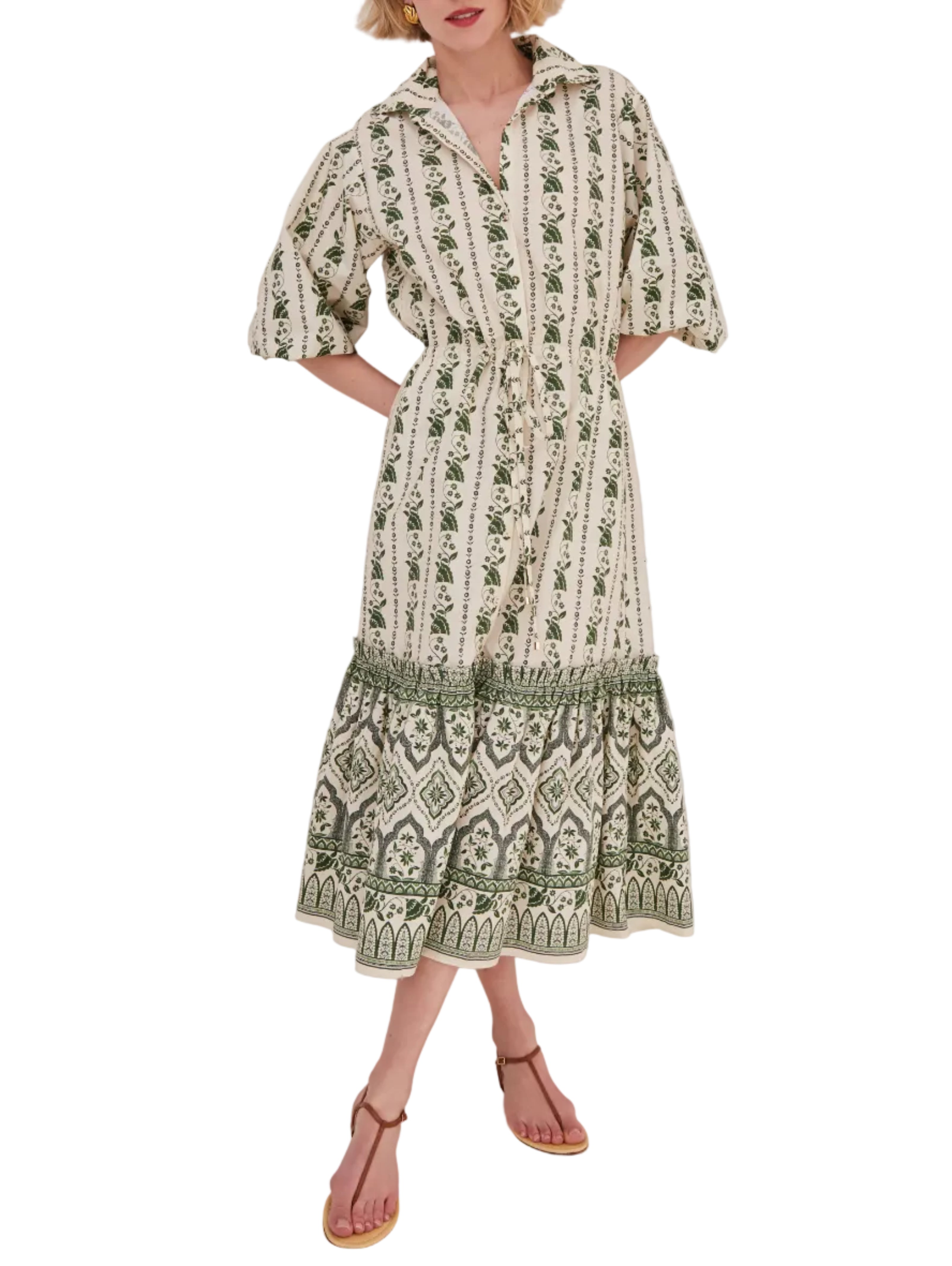 • Midi, long sleeve shirt dress with self-tie cinch waist and ruffle tier skirt