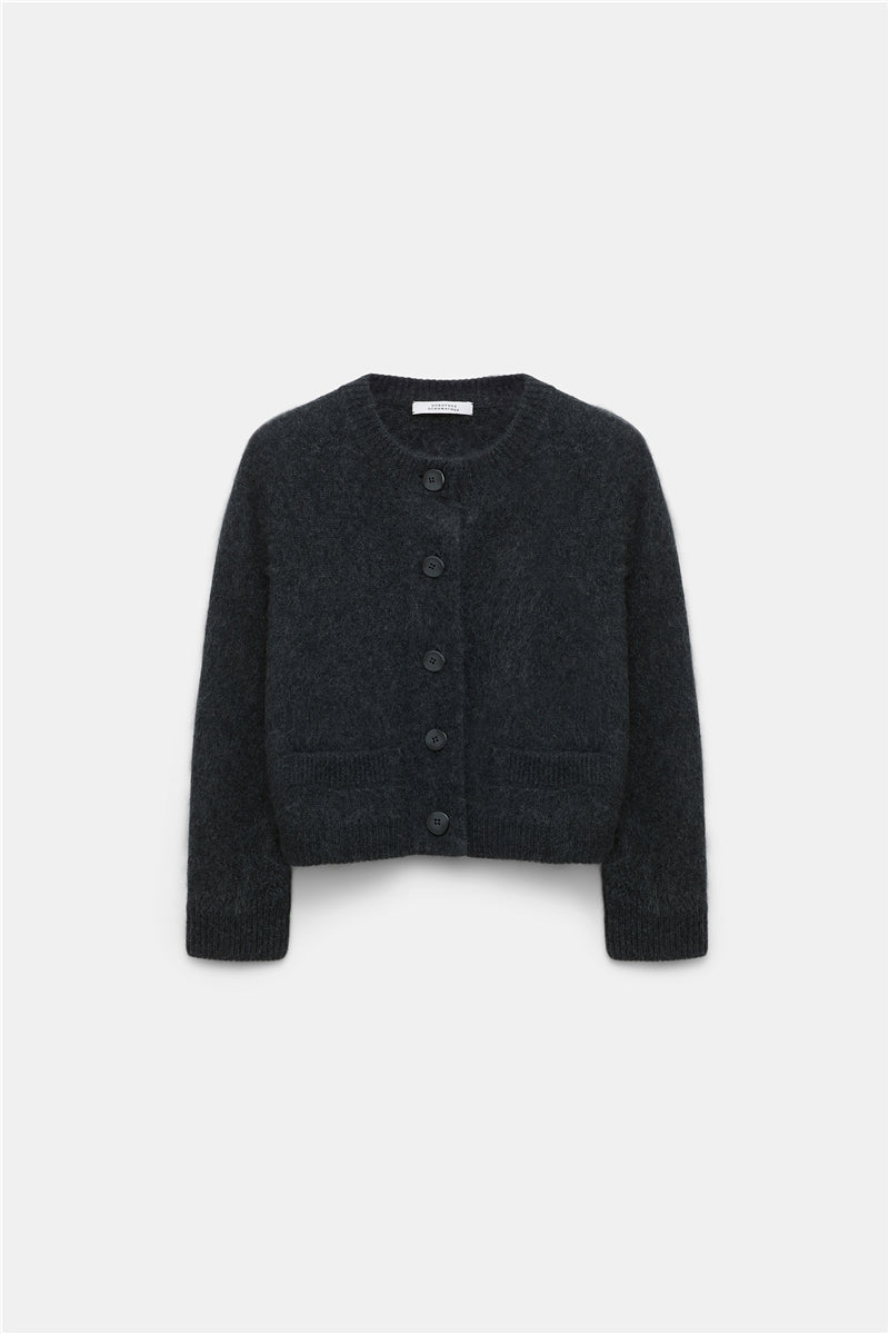 Cozy comes to mind: The cardigan has a round neckline and is knit in a soft cashmere-Merino wool mix. Our fluffy wash gives the boxy, cropped style an extra soft feel.