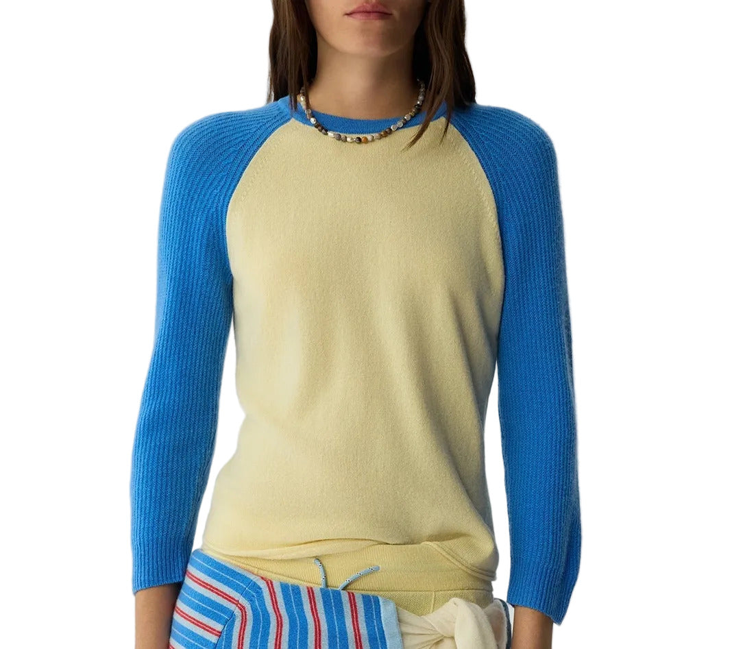 The baseball tee is a women's lightweight cashmere sweater featuring bold colorblock raglan sleeves and a sporty crewneck silhouette. Crafted from 100% cashmere, this versatile knit is perfect for everyday wear—style it with denim for an effortless look or pair it with the GIR track pant for a coordinated cashmere set.