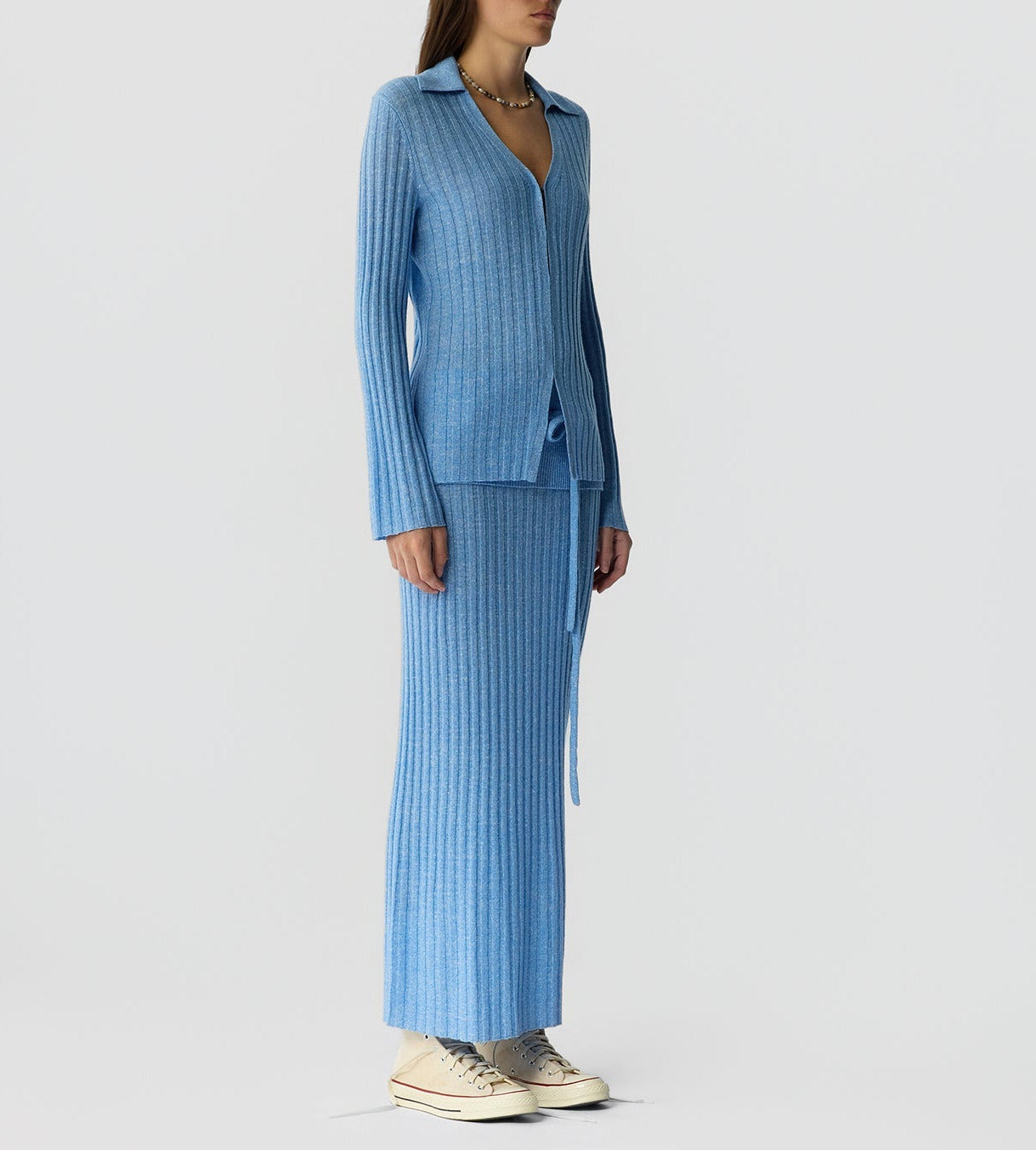 The Breezy Cardigan is a women's lightweight cashmere–linen cardigan featuring a ribbed texture, V-neckline, and polo-style collar. Finished with a hidden hook-and-eye closure, this breathable knit layers beautifully and pairs perfectly with the matching Lia skirt for spring and summer dressing.