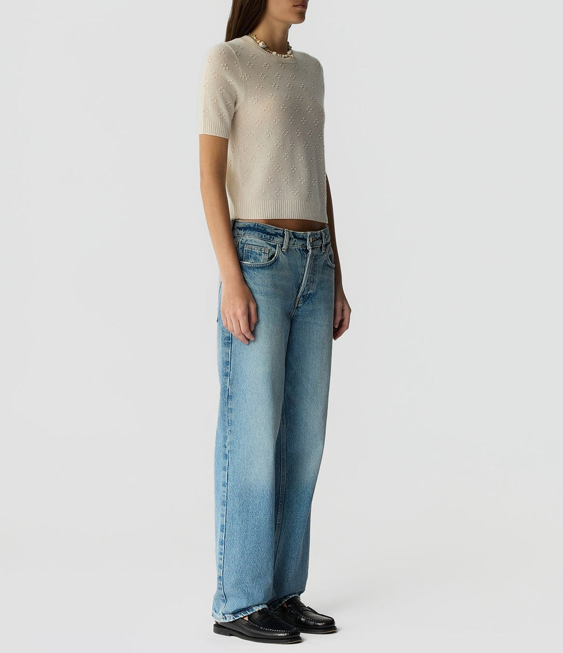 The Compass Sweater Tee is a women's lightweight cashmere short-sleeve sweater made from 100% cashmere with a textured popcorn stitch. Featuring a crew neck and ribbed trim, this versatile knit pairs effortlessly with denim or layers easily with other sweaters and cardigans.