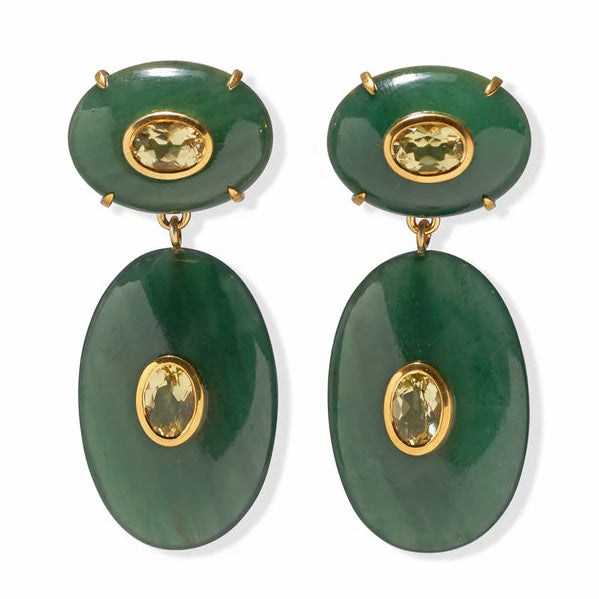 There's no place like here. Surrender to wickedly chic statement earrings in a double drop of green jade, inlaid with semiprecious lemon quartz stones.