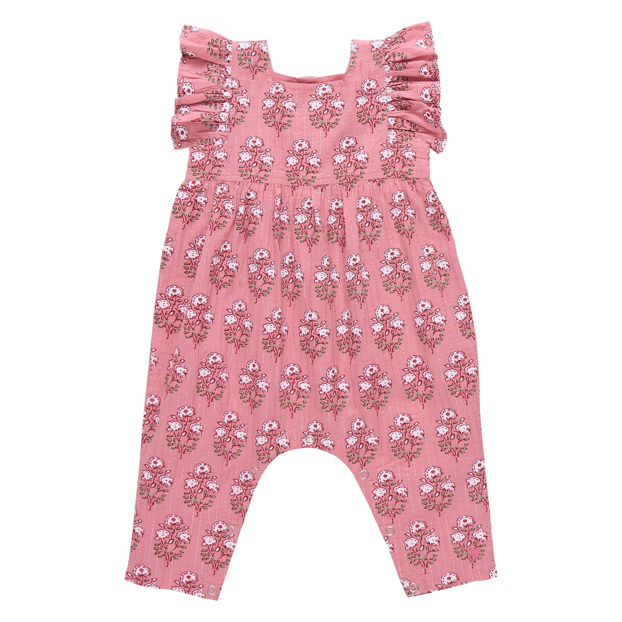 Blushing with charm, our Baby Girls Elsie Jumper in Pink Strawflower Block Print is a springtime delight. Ruffled sleeves and gentle gathers make it perfect for first adventures.