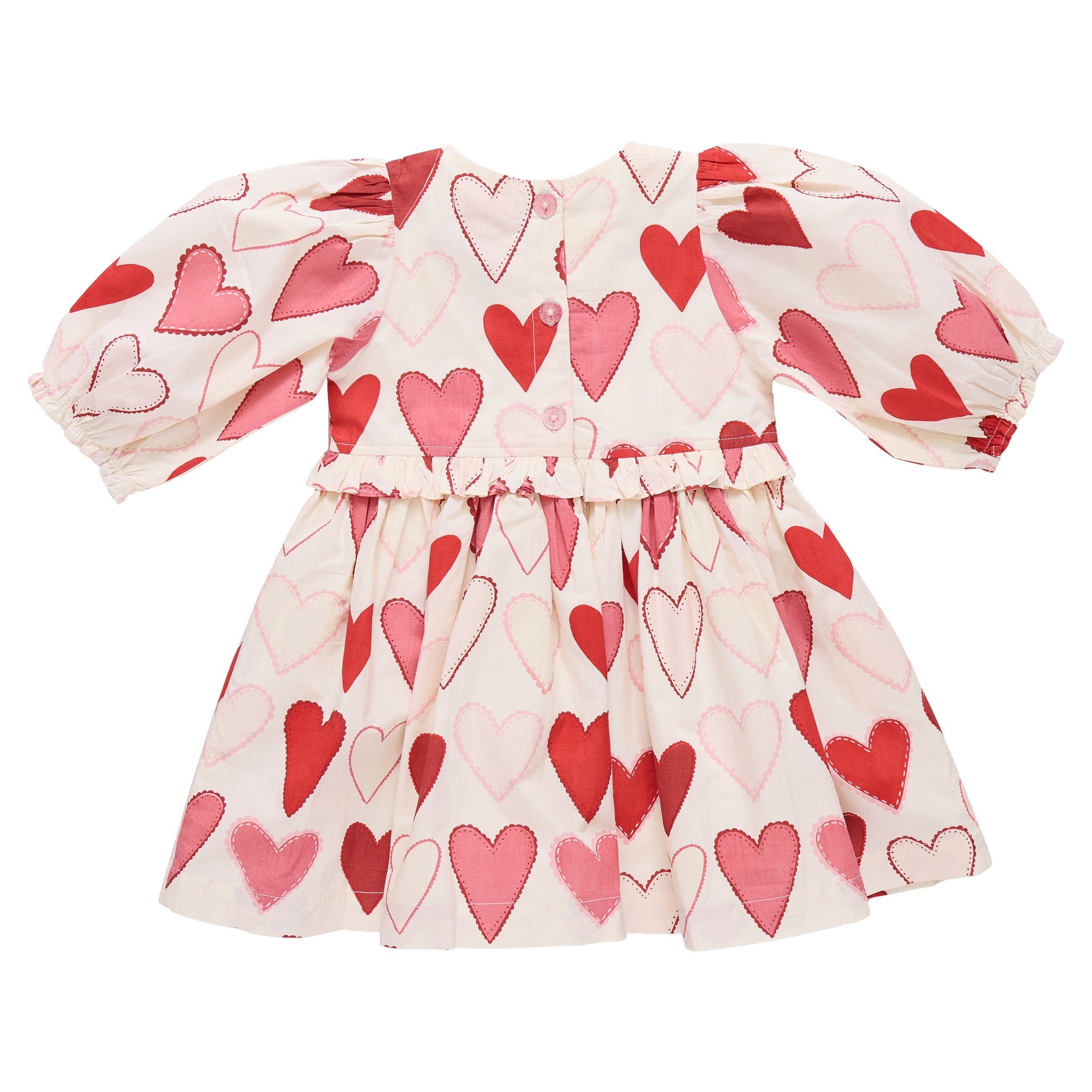 A brand-new silhouette we’re completely smitten with! The Renee Dress features dreamy gradient hearts, soft puff sleeves with elastic, delicate front pleats at the bodice, and charming ruffle details at the sleeves and waist. Finished with shimmering pink glitter buttons, this twirl-worthy style feels playful yet polished. Match with baby sis in the Renee Dress Set for a love-filled Valentine’s Day moment.