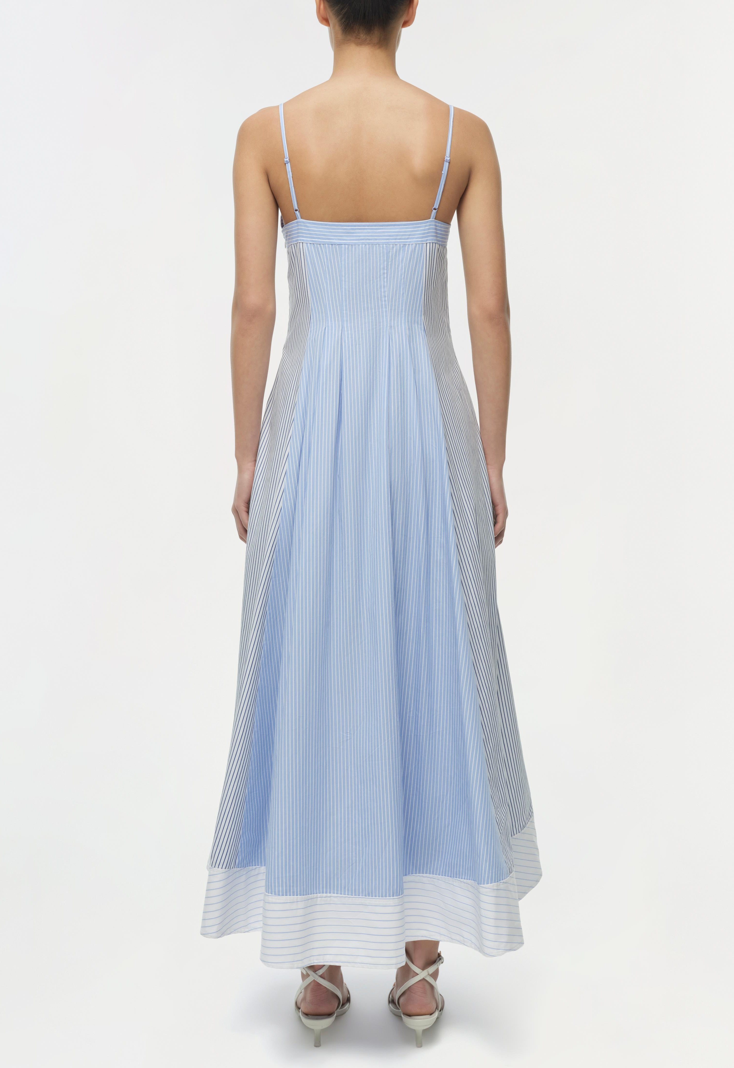 The Chamberlain Cotton Midi Dress in Periwinkle Multi Stripe. Crafted from lightweight cotton, this dress has a structured bodice and a softly pleated skirt. Cut to a flattering midi length, the silhouette is finished a delicate cami neckline for an effortless, refined mood.