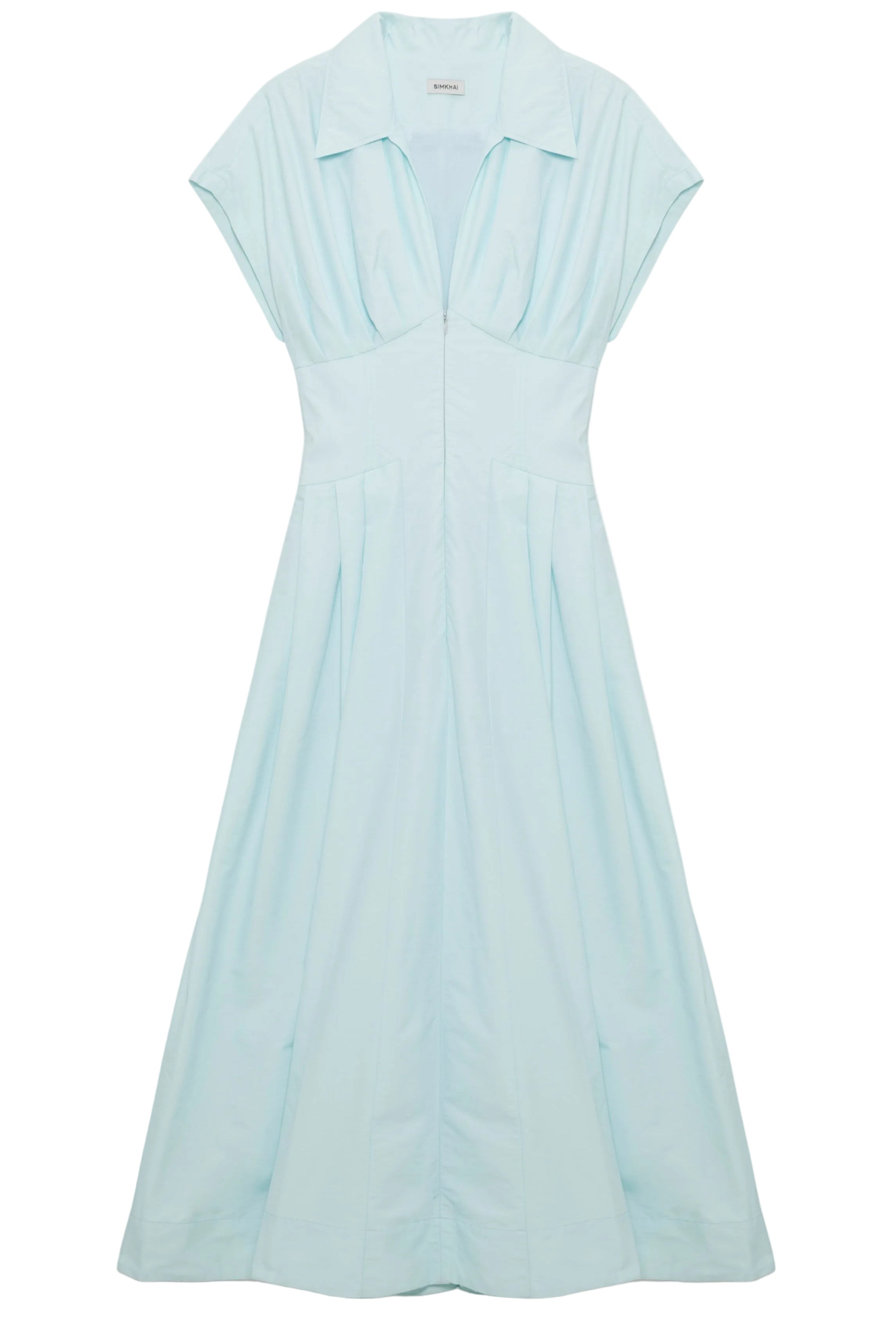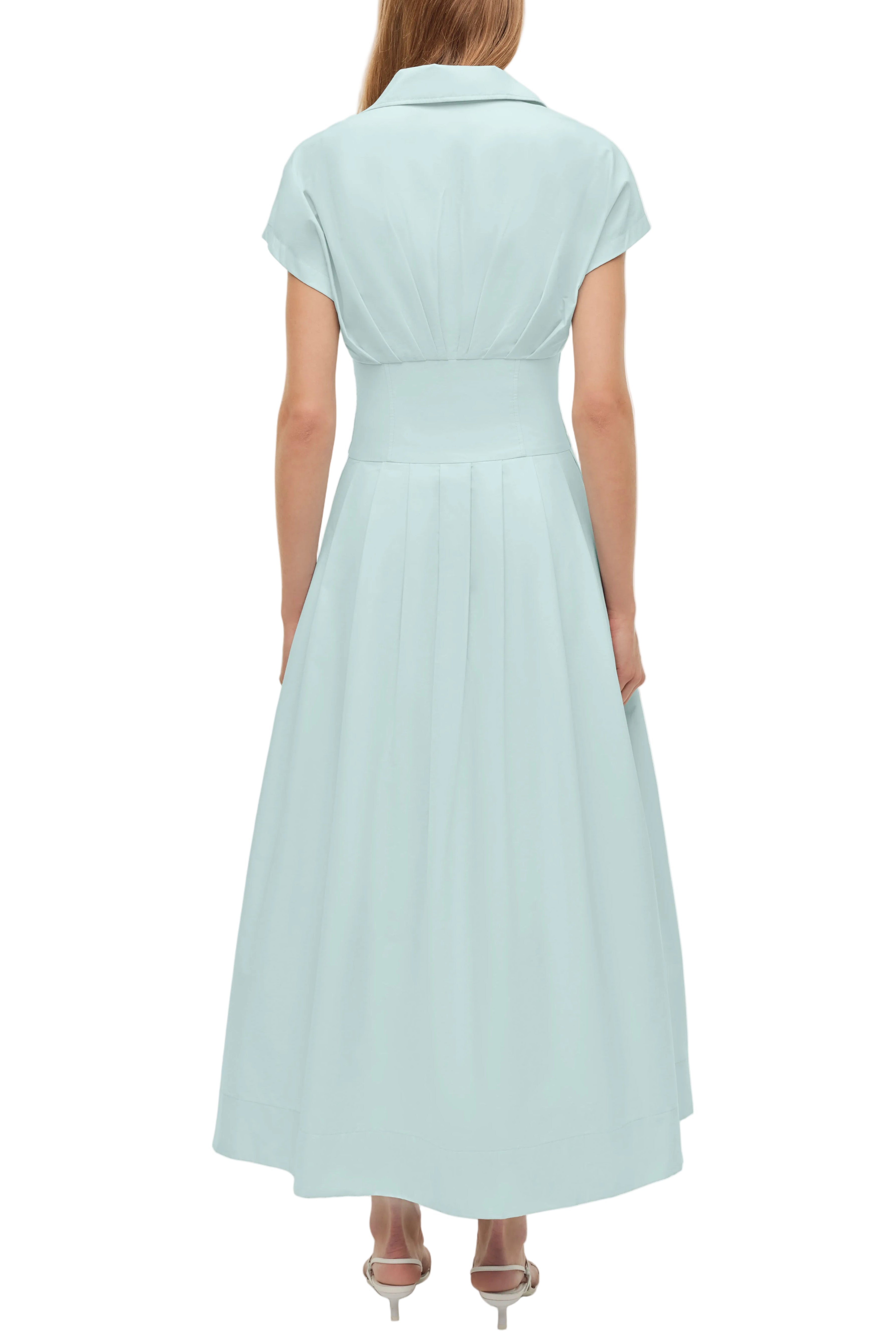 Crafted in crisp cotton faille, this dress holds it shape while offering effortless comfort. The midi-length silhouette falls with subtle ease, softly defining the waist of a polished, understated look.