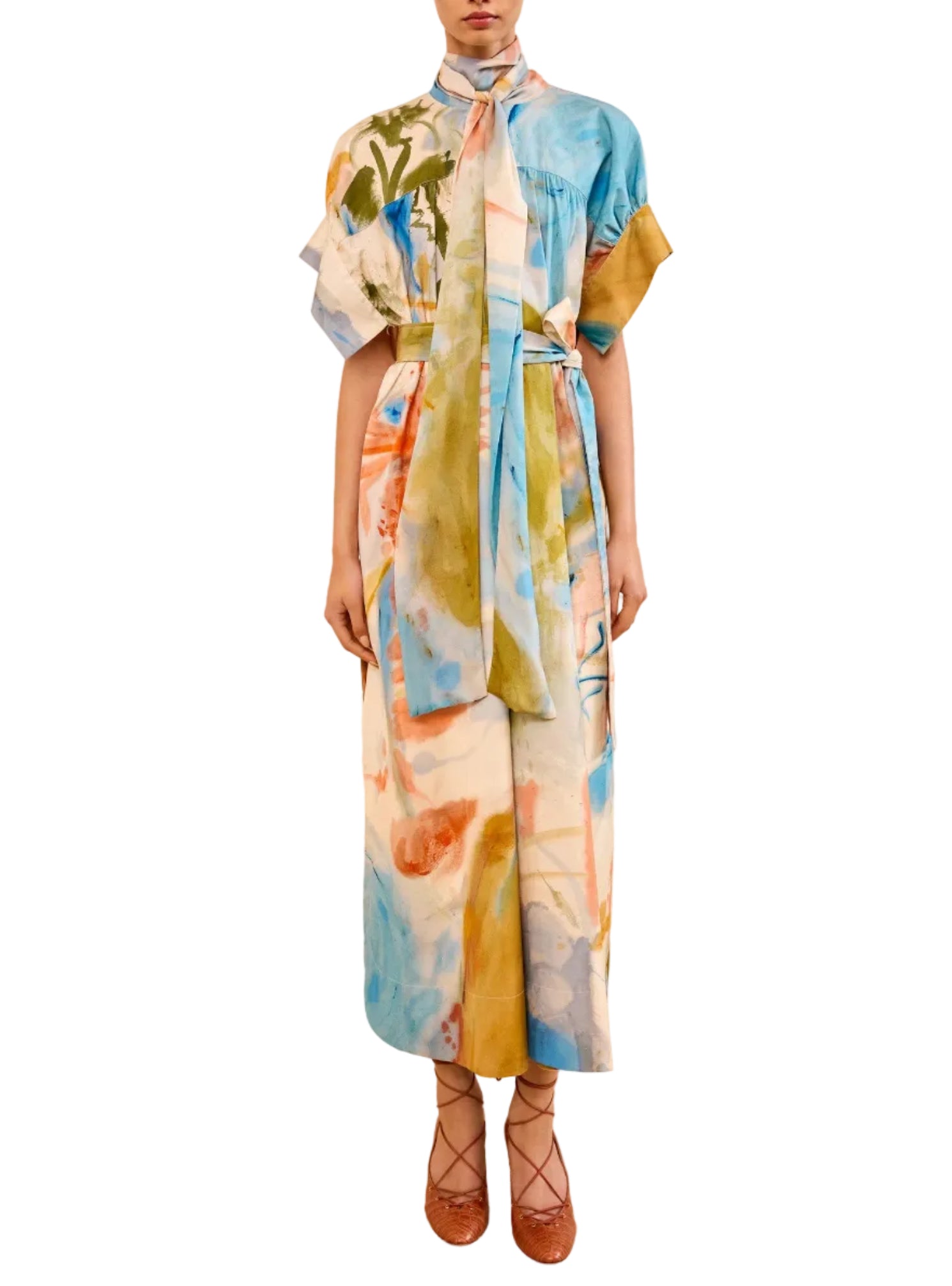 Showcased in Look 9 on the SS26 Runway, the Studio Dress is awash in lyrical, abstract imagery from Helen Frankenthaler’s 1957 painting "Western Dream.” This multicolored dress has an attached chiffon scarf that ties at the front or back, while the flyaway silhouette lends graceful volume.